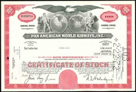 Pan American World Airways, Inc. stock certificate for 100 shares. 1971. Red & black. American Bank Note Co. imprint. Eagle and globes vignette. Cancelled, VF