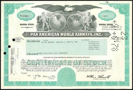 Pan American World Airways, Inc. stock certificate. 1978. American Bank Note Co. imprint. Eagle and globes vignette. Cancelled, VF
