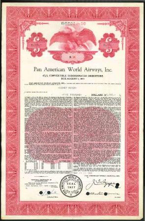 Pan American World Airways, Inc. 4 7/8% Convertible Subordinate Debenture bond. 1960. Franklin Lee Division - American Bank Note Co. imprint. Eagle vignette. Cancelled, VF