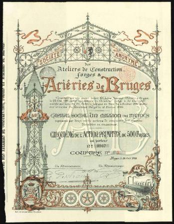 BELGIUM Ateliers de Construction Forges & Arieries de Bruges stock certificate. Bruges. 1896