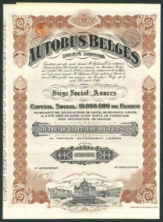 Autobus Belges stock certificate. 1924. Belgium imprinted revenue stamp. Issued, VF