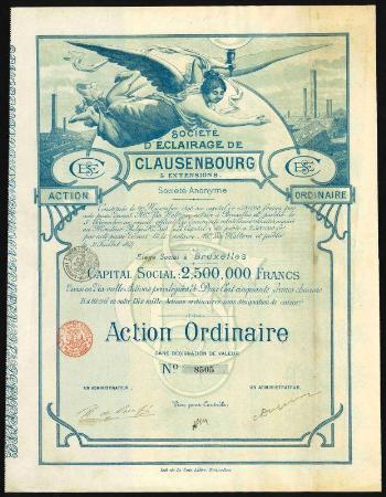 BELGIUM Societe D'Eclairage de Clausenbourg & Extensions stock certificate. Brussels. 1922