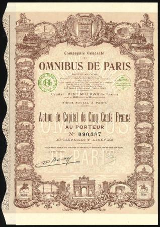 FRANCE Compagnie General des Omnibus de Paris stock certificate. Paris. 1910