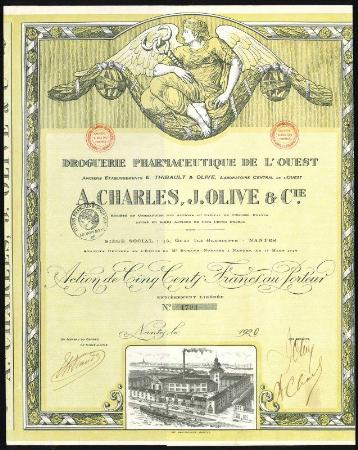 Droguerie Pharmaceutique De L'Ouest A. Charles, J. Olive & Cie. stock certificate. Nantes. 1920. Issued, VF