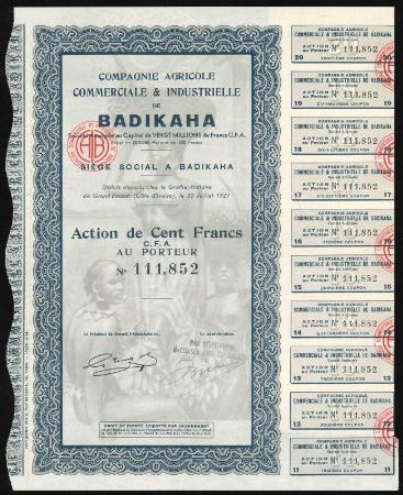 IVORY COAST Compagnie Agricole Commerciale & Industrielle de Badikaha stock certificate. Grand-Bassam. 1927