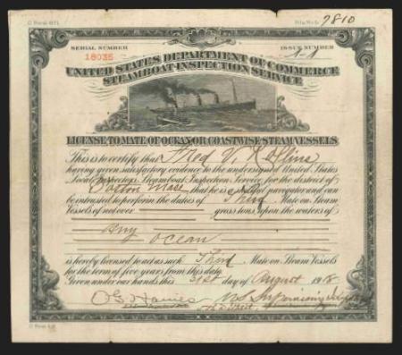 U.S. Department of Commerce, Steamboat Inspection Service, License to Mate of Ocean or Coastwise Steam Vessels