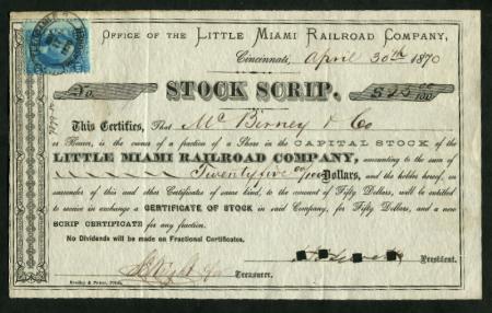 Little Miami Rail Road. L-15B, R33c black oval h/s ties stamp to a Stock Scrip certificate. Cincinnati, Ohio. 1870. Cancelled, VF | Description |  | Little Miami Rail Road Shellabear-Tolman / Scott L-15B, R33c 1682-71 10c Certificate, blue black oval h/s ties stamp to a Stock Scrip certificate. Cincinnati, Ohio. 1870. Cancelled, VF |  | | Bidding |  |