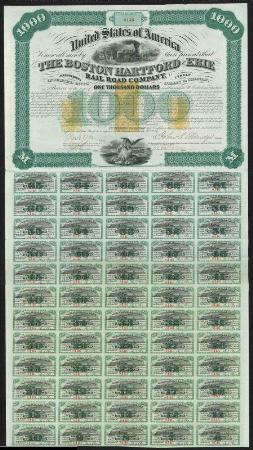 RN-W2, RN-P5 x 2 Boston, Massachusetts. Boston, Hartford & Erie Rail Road Company | Description |  | Scott RN-W2, RN-P5 x 2. Boston, Massachusetts. Boston, Hartford & Erie Rail Road Company $1,000 bond. 1866. Green & black on white. Printed by National Bank Note Co., New York. Train at station. Cancelled, VF