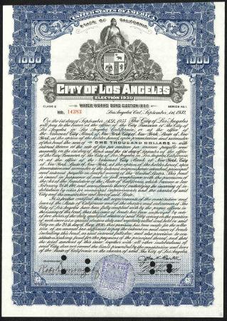 City of Los Angeles $1000 Water Works Bond Election 1930. Los Angeles, California. 1932. Cancelled, F reduced at top