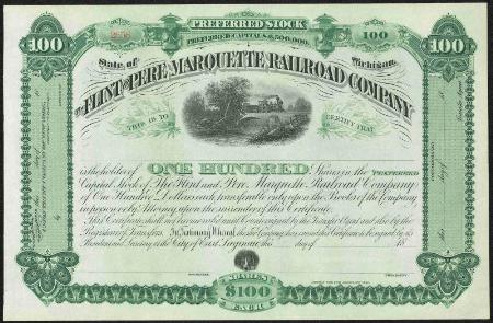 Flint & Pere Marquette Railway Co. stock certificate. East Saginaw, Michigan. 18__. American Bank Note Company, New York imprint. Train on bridge vignette. Unissued, VF