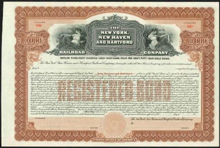 New York, New Haven and Hartford Railroad Company $10,000 Harlem, River-Port Chester First Mortgage 4% 50 Year Gold Bond. 19__. | Description |  | New York, New Haven and Hartford Railroad Company $10,000 Harlem, River-Port Chester First Mortgage 4% 50 Year Gold Bond. 19__. American Bank Note Company, New York imprint. Allegorical vignettes. Unissued, VF |  | | Click here for High Definition Images | | Bidding |  |