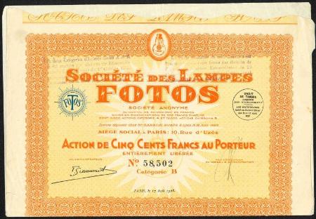 FRANCE Societe de Lampes Fotos stock certificate. Paris. 1928