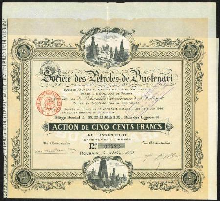 Societe des Petroles Bustenari stock certificate. Tourcoing. 1920. France imprinted revenue stamp. Issued, VF