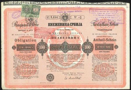 SERBIA Principality of Serbia 100 Franc bond. 1881.