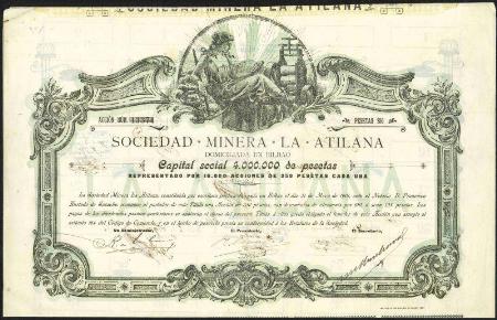 Sociedad Minera La Atilana stock certificate. Bilbao. 1901. Issued, VF