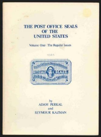 Perkal, Adam & Seymour Kazman. The Post Office Seals of the United States, Volume I, The Regular Issues. | Description |  | The Post Office Seals of the United States, Volume I, The Regular Issues. by Perkal, Adam & Seymour Kazman. Illustrated study of the essays, proofs, stamps, and covers, the definitive work on the subject. 1984. Card covers. 160 pages. Used, VF cover soiling |  | | Bidding |  |