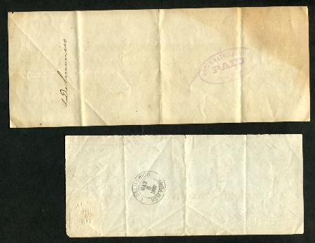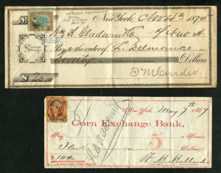 two bank checks, each with a stamp tied by handstamp cancel. New York, N.Y. 1867 & 1875. Lorenzo was one of the founders of the original Delmonico's Restaurant. The latter check is endorsed by him on the back. F-VF