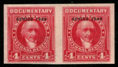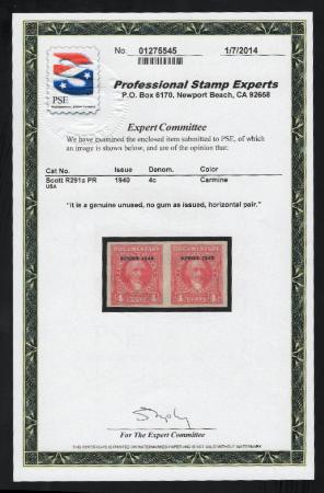 R291a horizontal pair, imperforate, without gum, mint, F-VF. PSE Certificate | Description |  | Scott R291a 1940 4c carmine (Albert Gallatin) horizontal pair, imperforate, without gum, mint, F-VF. PSE CertificateVF |  |  | | Bidding |  |