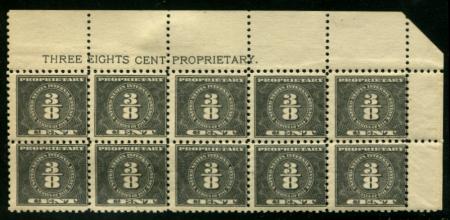 block of 10, THREE EIGHTS CENT PROPRIETARY in top margin, mint, F