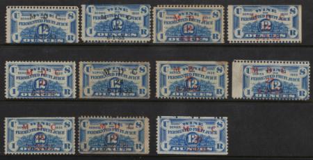 M D C (Mission Dry Corporation) printed cancels in black or red, 11 different dates. Used, F small faults