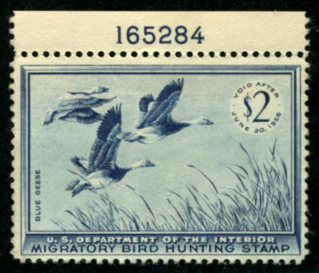 RW22 top plate No. 165284 single, mint, NH, F-VF | Description |  | Scott RW22 1955 $2 dark blue, Blue Geese top plate No. 165284 single, mint, NH, F-VF |  | | Bidding |  |