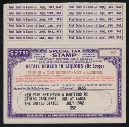 Retail Dealer in Liquors At Large F.Y.E. 1943 $27.50 purple & red issued to the New York, New Haven & Hartford Railroad, VF creases