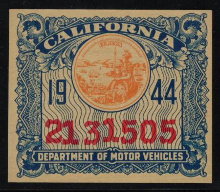 CA Motor Vehicle License stamp. 1944, mint, VF