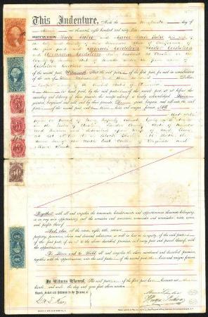 NV D8, NV D9 strip of three, US R62a, R78a & R81c Deed for the sale of land in Austin, Lander Co., Nevada | Description |  | SRS NV D8 1865 50c brown purple & $1 deep red, 1862-71 50c Probate of Will, blue, $1.50 Inland Exchange, blue & $2 Conveyance, red Deed for the sale of land in Austin, Lander Co., Nevada by Hugo & Marie Sutro to Samuel, Isidor & Abraham Goldstein. San Francisco, California. 1866. Fine, light staining and some separation, possibly missing a stamp