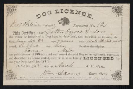 VT Dog License. Brookline, Vermont. 1882. Used, VF