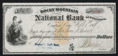 RN-B1 Central City, Colorado. Rocky Mountain National Bank | Description |  | RN-B1. Central City, Colorado. Rocky Mountain National Bank draft drawn on Mercantile National Bank, New York. 1869. Black & red on white. Printed by Western Bank Note & Eng. Co., Chicago. Liberty with anchor, ship, wheat, train in background, Arm & hammer. Used, VF |  | | Click here for High Definition Images | | Bidding |  |
