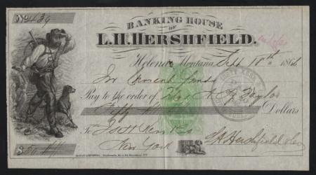 Scott RN-B6. Helena, Montana. Banking House of L.H. Hershfield draft. 1866-7. Black on white. Printed by Macoy & Herwig, Stationers, 112 & 114 Broadway, N.Y. Miner and dog. Used, VF