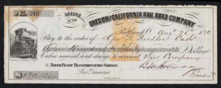 RN-B16. Portland, Oregon. Oregon and California Rail Road Company draft drawn on North Pacific Transportation Company, San Francisco. 1870. Black on white. Printed by Lith. Britton & Rey, S.F. Signed by Ben Holladay. Train. Used, VF stain at top left
