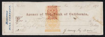 RN-B16a. Virginia, Nevada. Agency of The Bank of California, Mariposa Mill bank check. 1870. Brown & blue on white. James G. Fair autgraph. Used, VF light soiling