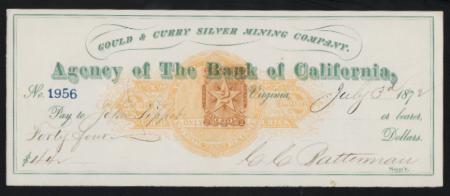 Scott RN-C21b. Virginia, Nevada. Agency of The Bank of California, Gould & Curry Silver Mining Company bank check. 1872. Green on white. Used, VF