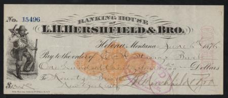 RN-D1 Helena, Montana. Banking House of L.H. Hershfield & Bro. | Description |  | Scott RN-D1. Helena, Montana. Banking House of L.H. Hershfield & Bro. draft drawn on Kountze Bro's, New York City. 1876. Black on white. Printed by John Hamilton, Stationer, 95 William St., N.Y. Miner. Used, VF |  | | Click here for High Definition Images | | Bidding |  |