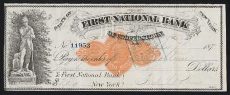 Scott RN-D1. Cooperstown, New York. First National Bank of Cooperstown draft. 1874. Black on white. Printed by Dennison & Smith, Stationers, 40 Pine St. N.Y. Leatherstocking. Used, VF