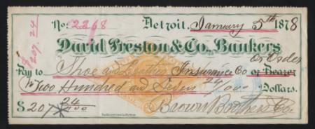 Scott RN-G1. Detroit, Michigan. David Preston & Co., Bankers bank check. 1878. Green on white. Printed by Calvert Lith. Co., Detroit. Used, VF
