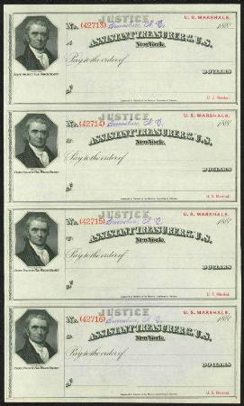Assistant Treasurer of the U.S. New York. Justice Dept, U.S. Marshals draft. Greensboro, North Carolina | Description |  | Assistant Treasurer of the U.S. New York. Justice Dept, U.S. Marshals draft, sheet of four. Greensboro, North Carolina. 188_. Bureau, Engraving & Printing engraved. Vignette of John Marshall. Unused, VF |  | | Click here for High Definition Images | | Bidding |  |