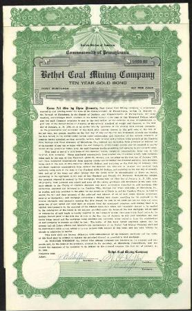 Bethel Coal Mining Company $1000 Ten Year First Mortgage 6% Sinking Fund Gold Bond. Ebensburg, Pennsylvania. 1924. 18 coupons. Vignette of loading coal cars. Cancelled, VF