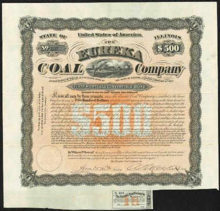 Eureka Coal Company $500 10% First Mortgage Convertible Bond. Illinois. 1875