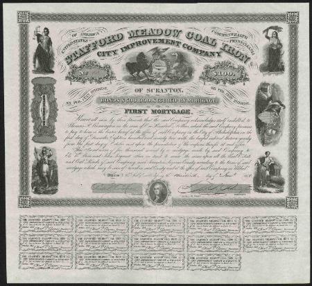 Stafford Meadow Coal Iron City Improvement Co. of Scranton $100 First Mortgage bond. Scranton, Pennsylvania. 1858.