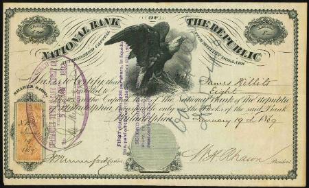 National Bank of the Republic stock certificate. Philadelphia, Pennsylvania. 1869. R44c