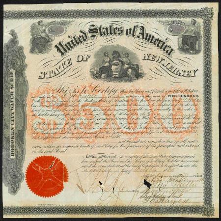 Hoboken City Water Board $500 bond. Hoboken, New Jersey. 1822