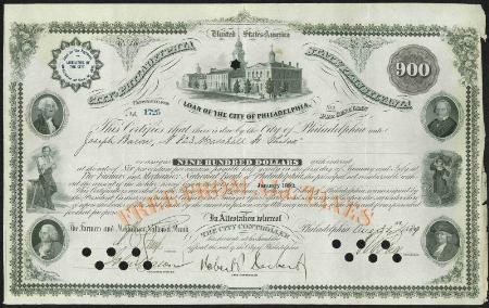 City of Philadelphia $900 6% loan certificate. 1889. Philadelphia, Pennsylvania. American Bank Note Co. imprint. Numerous vignettes. Cancelled, F-VF a bit tattered at right side