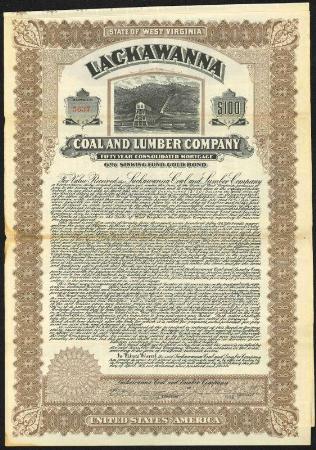 Lackawanna Coal and Lumber Company $100 50 Year Consolidated Mortgage 6% Sinking Fund Gold Bond. West Virginia. 1911