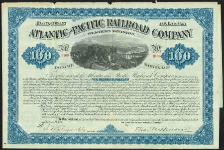 Atlantic and Pacific Railroad Company $100 income mortgage bond. 1880