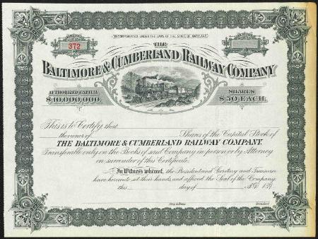 Baltimore & Cumberland Railway Company stock certificate. Maryland. 189_.