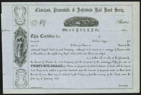 Cleveland, Painesville & Ashtabula Rail Road Co. stock scrip certificate. Cleveland, Ohio. 1854.