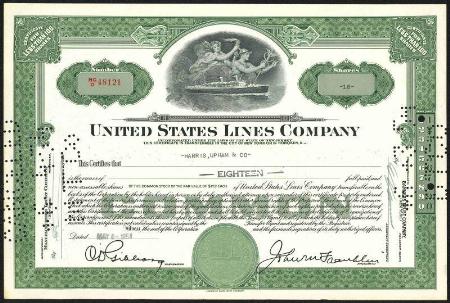 United States Lines Company stock certificate for less than 100 shares. 1954. American Bank Note Company imprint. Ship and allegorical vignette. Cancelled, VF
