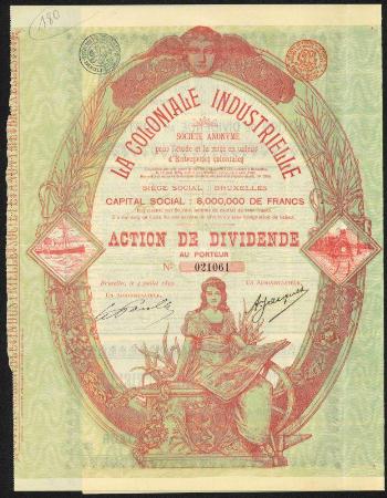 BELGIUM La Coloniale Industrielle stock certificate. Brussels. 1899